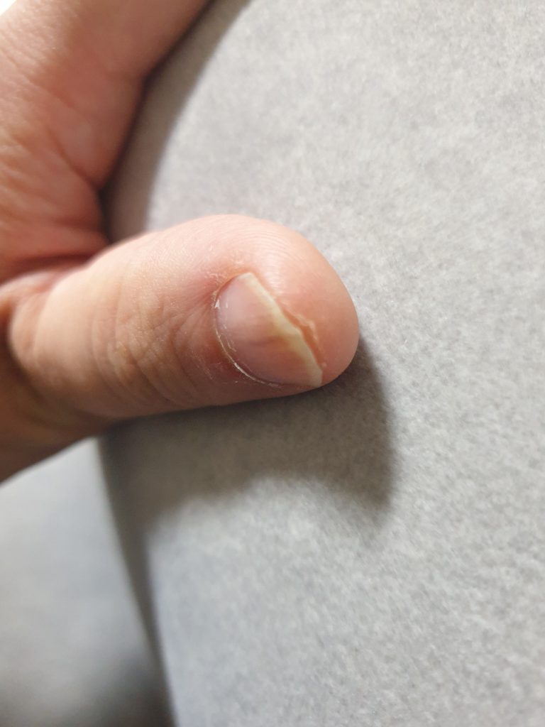 강한 충격이나 반복적으로 약한 충격을 받은 경우 손발톱 아래에 혈액이 고여 있어 까맣게 조갑이 변색되는 조갑하혈종과의 감별도 필요하며, 한쪽 손/발가락에만 발생한 경우 내원하시어 진찰 받으시길 권유드립니다. 감사합니다.