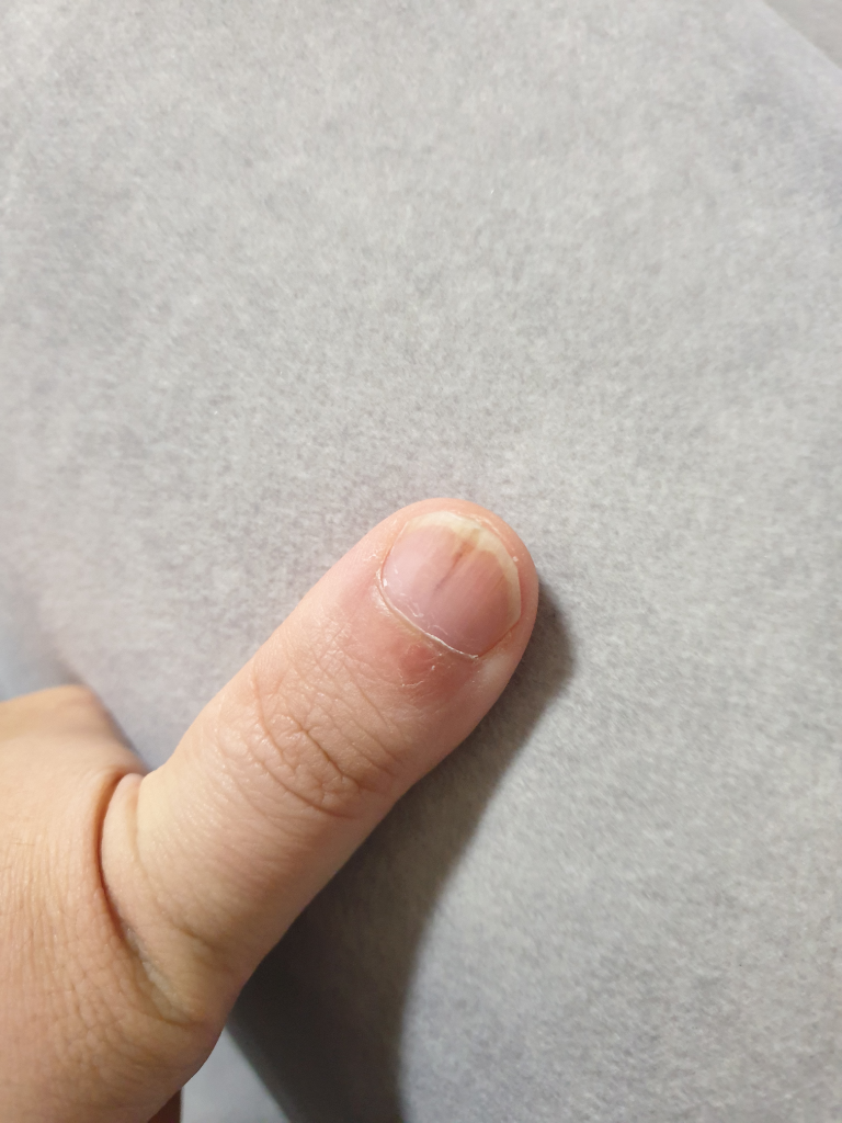 현재 사진을 봤을 때는 손톱유두종(onychopapilloma)의 가능성이 커보입니다.
