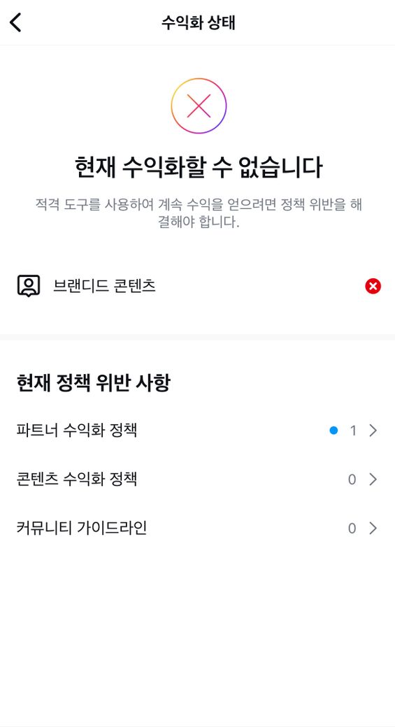 브랜디드 콘텐츠에 엑스 표시가 있고 현재 정책 위반 사항에는 인지도가 포함되어 있습니다