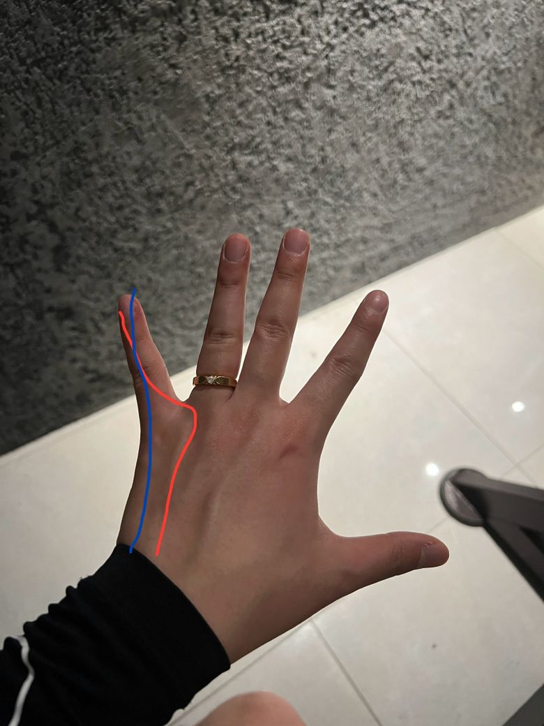 손가락의 힘줄이 보통 손가락 뼈를 따라 손바닥으로 쭉 이어지는데 저는 새끼손가락의 힘줄이 옆으로 이어져 있습니다