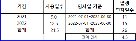 줘야 합니다. 질문자님이 2021년 7월 1일에 입사하여 2022년 12월 30일에 퇴사한 경우 재직기간 중 발생한 총 연차는 26개