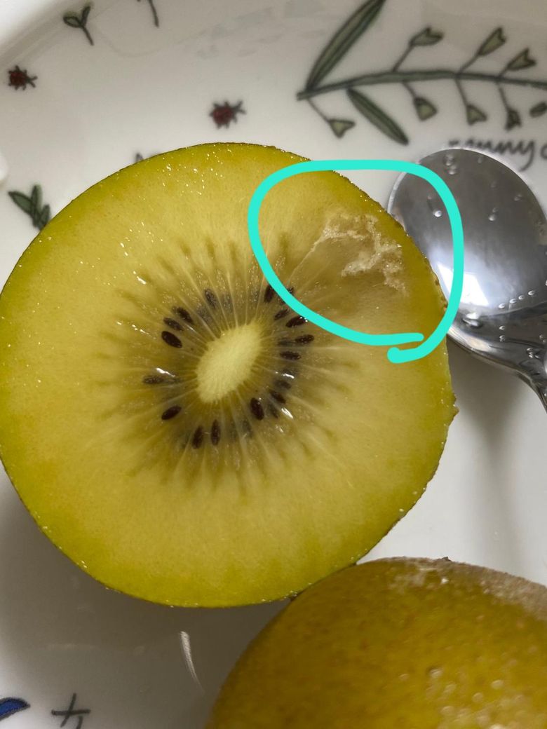 키위에 보이는 흰색 뭉친 부분은 자연스러운 섬유질 덩어리일 수도 있고 충격이나 상처로 인해 생긴 것일 수도 있어요. 신선하고 냄새가 이상하지 않다면 그 부분만 도려내고 먹어도 괜찮답니다~냄새가 이상하거나 과육이 물러졌다면 먹지 않는 게 좋아요!!