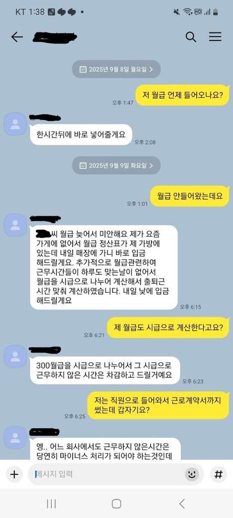 며칠 뒤에 사장님이 갑자기 카톡으로 '월급 300만원을 시급으로 환산해서 일찍 퇴근한 시간을 차감하고 지급하겠다'고 통보하셨습니다.