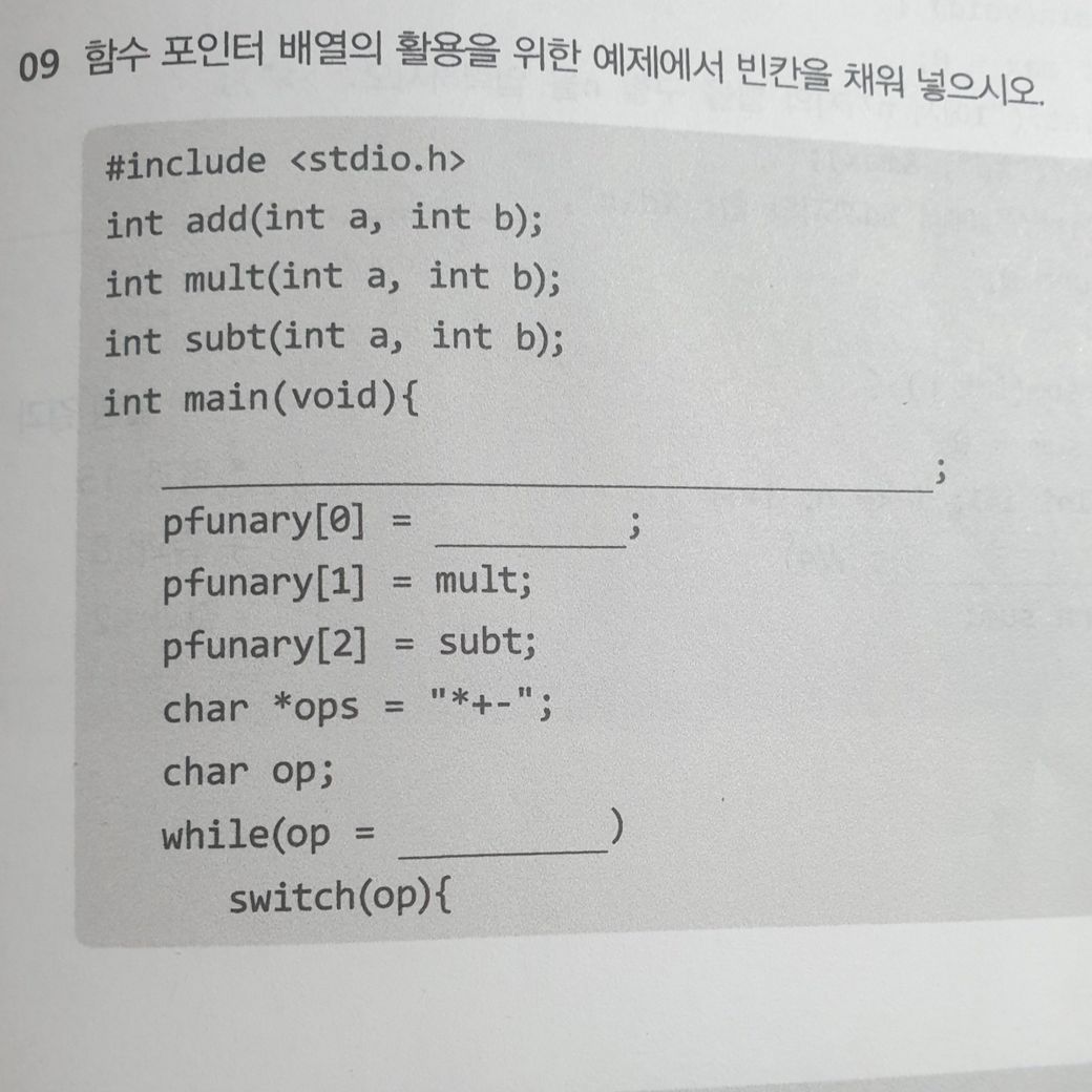 문제보면 빈칸이 되었는데int a[ ]={0,1,2};넣는거 같고 pfunary[0]=add;빈칸 맞는 줄 모르겠지만 여튼 빈칸 문제좀 도와주세요?