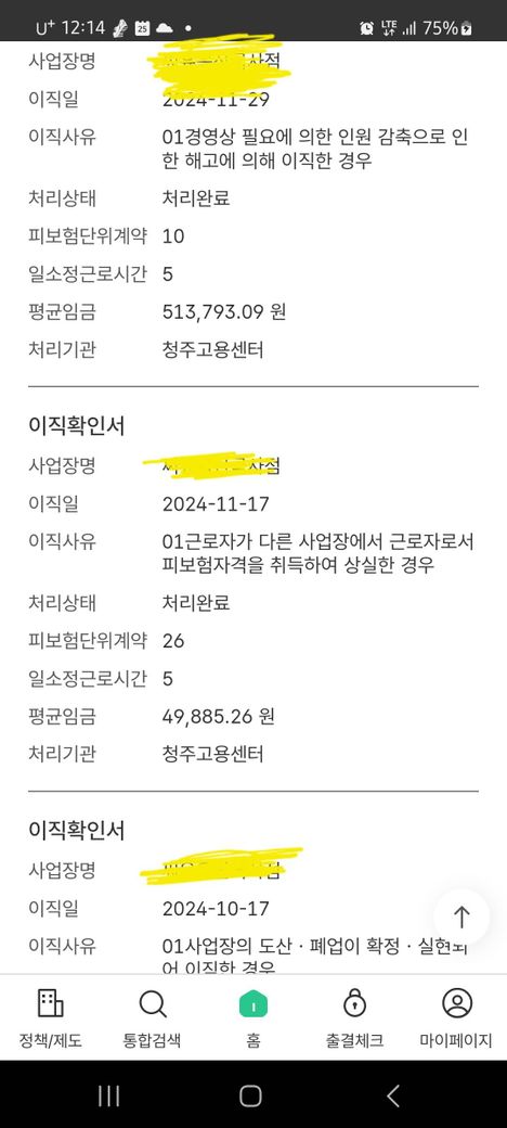 A"(같은편의점, 새점주)편의점에서 11.29일까지 일했습니다. 중간에 하루 다른곳에서 일한게 일용직 처리가 됐는데 그때 일당이 더 쎄서 고용보험이 그쪽으로 신청되는 바람에