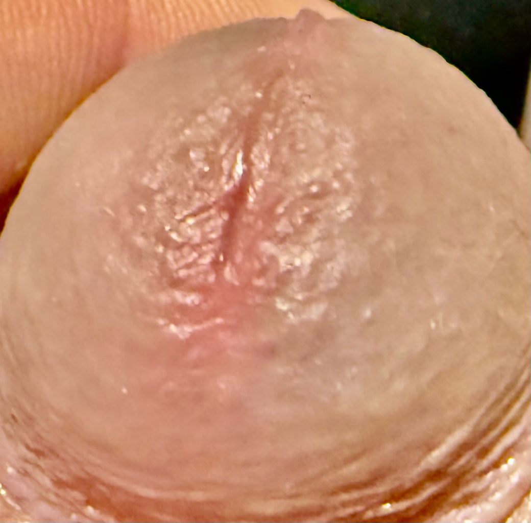 사진상 요도구(요도 입구) 주변에 국소적인 홍반과 미세한 균열처럼 보이는 선상 병변이 관찰됩니다. 뚜렷한 수포(물집), 다발성 군집 병변, 사마귀 모양의 돌출, 궤양성 함몰은 뚜렷하지 않습니다.