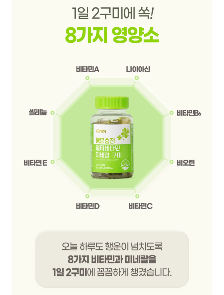 • 멀티비타민 미네랄 구미(비타민A포함 비타민 8종&미네랄 함유, 1일 2회), 콜라겐 구미