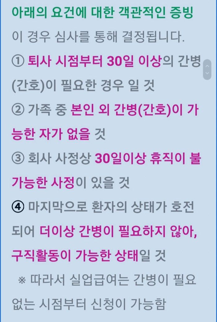 ☞ 간병으로 인한 퇴직 시 환자 가족은 다음의 요건을 모두 갖춘 경우에 구직급여를 지급합니다.