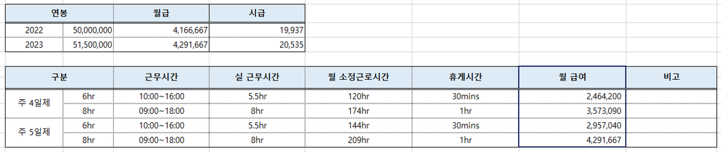 주 5일→주4일 및 근무시간 변경 시 월급계산
