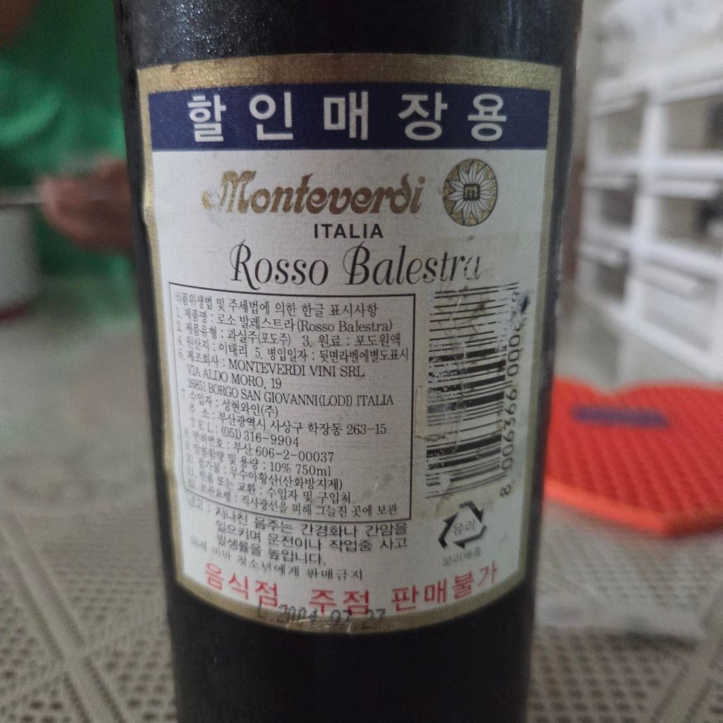병으로 봐서 이태리의 몬테베르디, 비노 로쏘 발레스트라 는 레드 와인 입니다. 20년 된 와인이라 마시기가 좀 쉽지 않을 듯 한데 냄새를 맡아 보세요. 냄새에서 시큼한 식초, 흙, 고무, 석유, 양배추, 황,생선, 젖은 모, 메니큐어 에나멜, 강한 코르크 향,곰팡이 냄새등과 같은 역한 냄새가 느껴진다면 이 와인들은 마시지 않는 것이 좋다고 합니다.