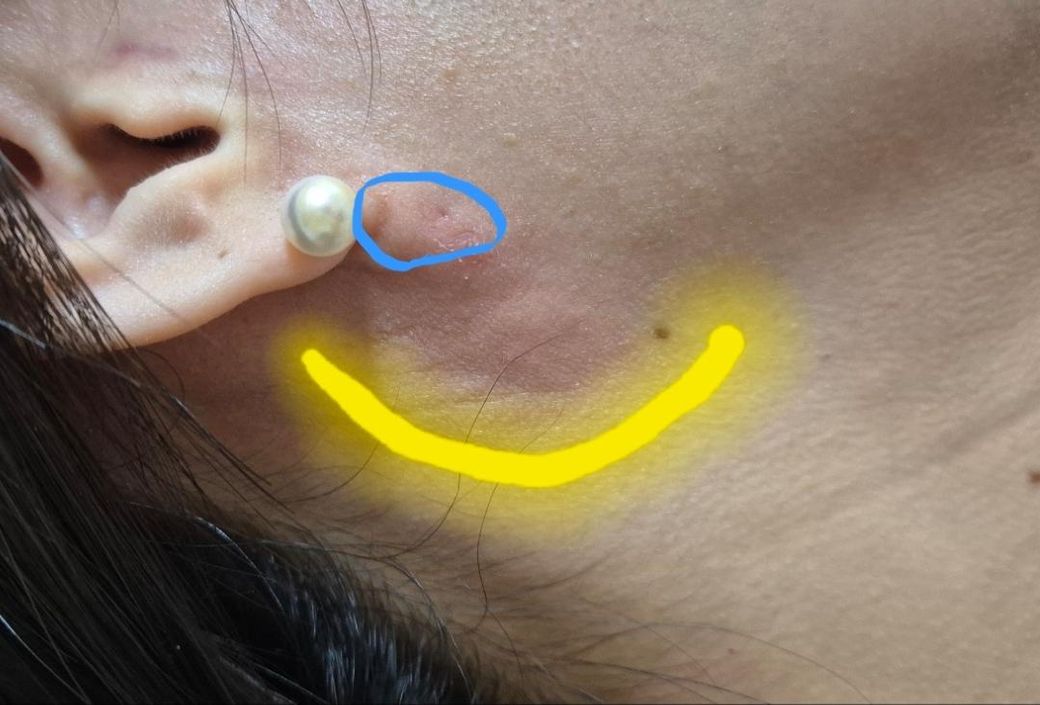 위사진과같이 귓볼아래 파란색 동그라미 부위는 애말로는 피지가있어서 계속 짯다고하고 노란색부위가 좀 부어오른거 같은데 무슨과로가야하고 혹시 병명이 뭘까요?수술하거나 그러진 안겠죠?