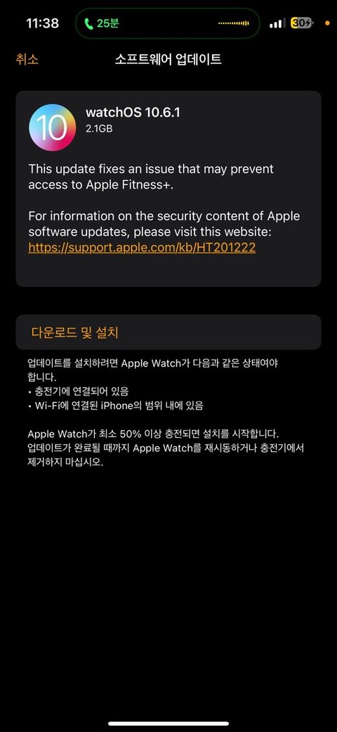 이렇게까지 뜨고난 이후 다운로드 및 설치를 했더니 업데이트 오류가 발생했고 이후 계속 시도해보니 아래화면처럼 바뀌고 아무런 반응이 없습니다.어떻게 해야할까요? 애플워치도 아이폰처럼 강제로 끌수있나요?아직 답변이 없어요.