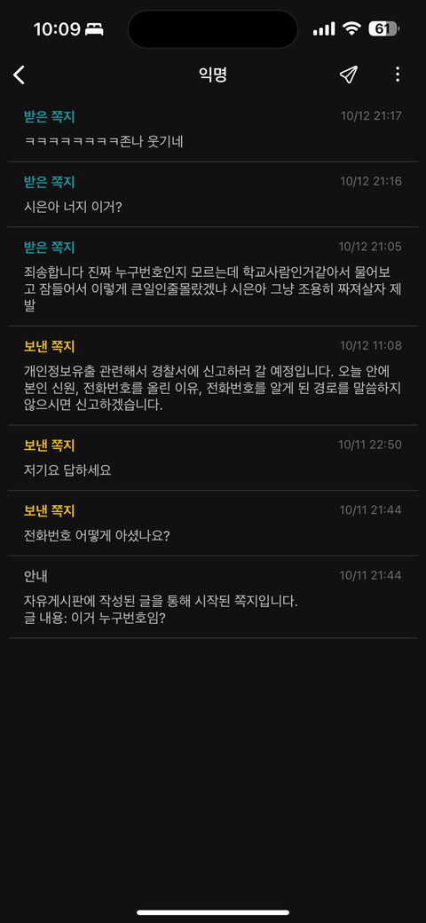 학교 익명게시판에 제 전화번호를 고의로 유출한 사람을 개인정보보호법 위반(침해)으로 수사 또는 신고를 하고싶은데 방법이 있을까요..? 저 사람이 누구인지 알아내고싶습니다.. 상대방은 저를 알고있지먼 저는 상대방을 알지못해 불안합니다.. 도와주세요