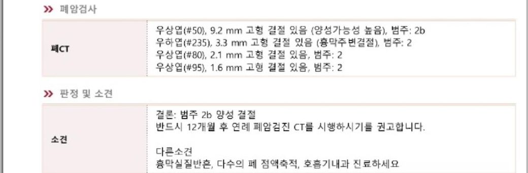 제공해주신 결과지를 해석하면, 폐 CT에서 여러 개의 작은 결절(혹)이 발견되었고, 가장 큰 것은 약 9.2mm이며 나머지는 3.3mm, 2.1mm, 1.6mm 정도의 매우 작은 크기입니다. 중요한 점은 이 결절들이 모두 “고형 결절”이지만 판정이 ‘범주 2b, 양성 결절’로 되어 있다는 것입니다. 이는 현재 영상 소견상 암일 가능성이 매우 낮고, 대부분 과거 염증 흔적이나 흉터, 미세한 석회화 변화 등으로 해석되는 단계입니다.