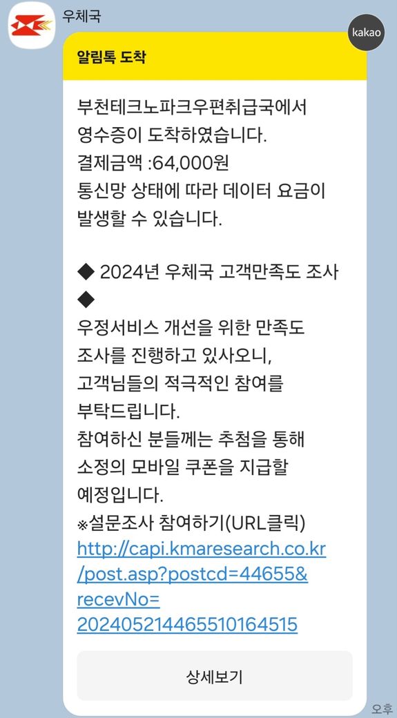 문자가 방금 우편취급국에서 이렇게 왔는데 저는 최근에 결제한 내역이없어서...예전에도 64,000원치 결제한 금액이 없거든요 혹시 왜 왔는디 알 수 있을까요?