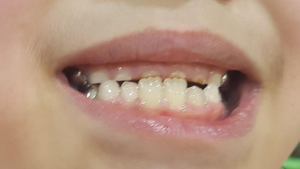 위 앞니가 썩고 마모되어 현재와 같은 상태로 보이는 것인데요 계승 영구치가 잘 맹출중이라면 너무 걱정하지는 않으셔도 되겠습니다.