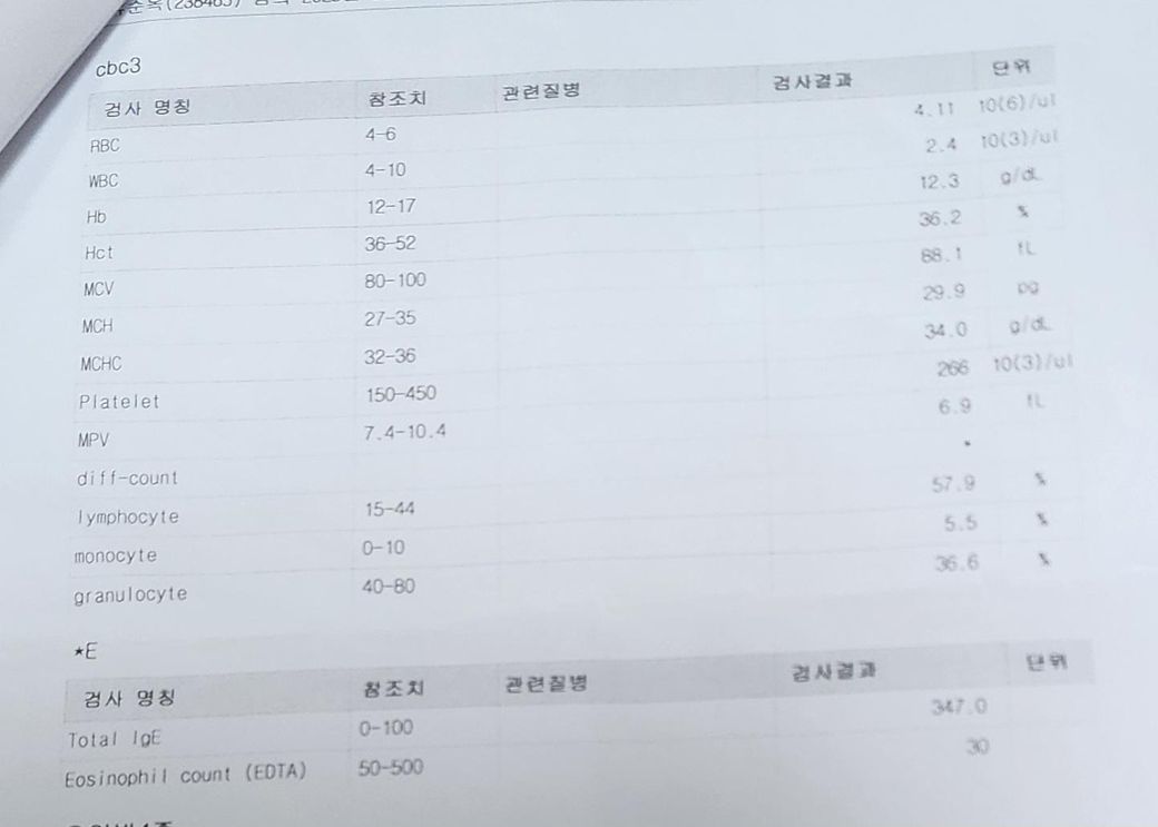 IgE 수치가 높으면 알러지를 의심해볼 수 있는 소견입니다.