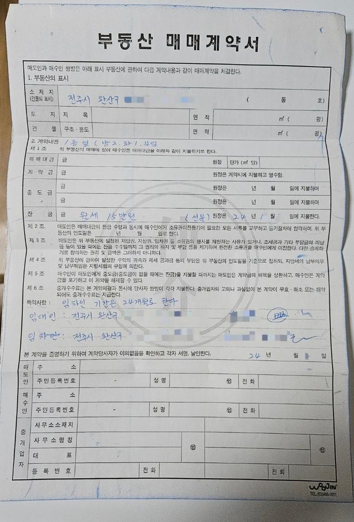 ㆍ부동산을 거치지 않고 집주인과 저 둘이서 계약했으며. 월세임에도 부동산 매매계약서에 매우 약식으로 작성하였습니다. (사진 첨부)