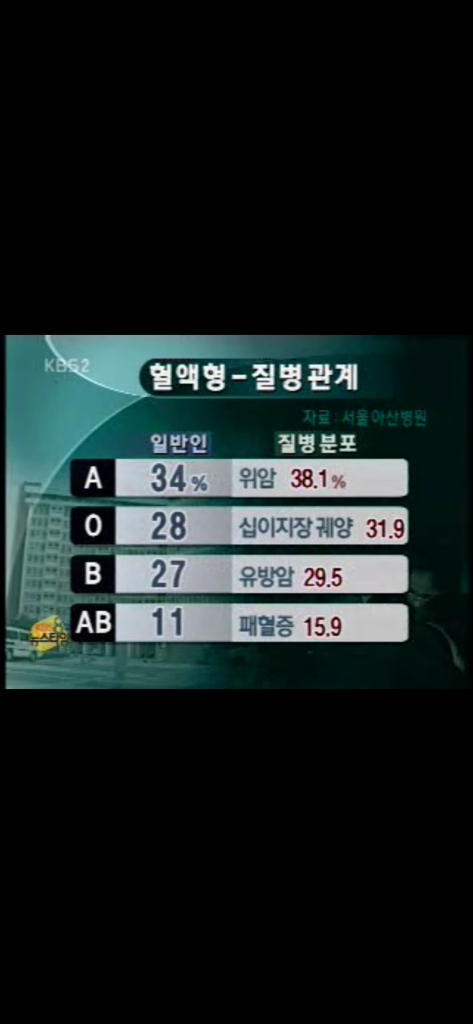사진 속의 내용은 말씀하신 것처럼 질병이 없는 일반인에서 A형이 34%인데, 위암 환자 중에서는 A형이 38.1% 있고 다른 혈액형에 적힌 질환들도 그렇게 해석하는 것이 적절해 보입니다.