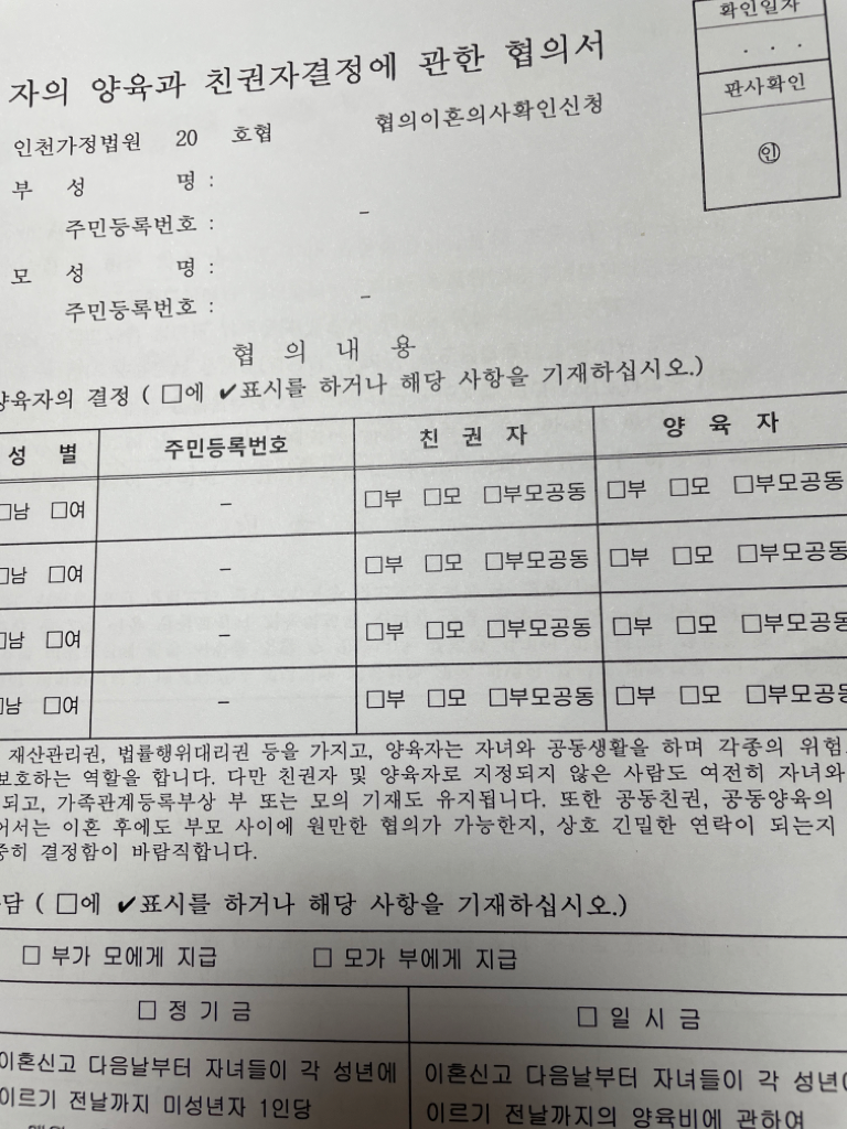 해당서류에 표시를 하셔서 제출하시면 되고 중요한 것은 협의이혼의사확인기일에서 판사님 앞에서도 부부 둘다 일치해서 단독친권으로 협의된 것이 맞다고 하셔야 됩니다.