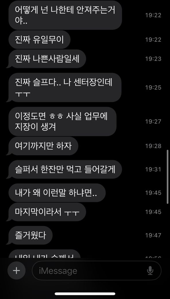 꼰대 집착 허언증 정치질 내로남불 가스라이팅 다 하는 중인데 대면으로 말 한건 훨씬 많은데 증거가 없음, 문자로 성희롱 + 집착 + 찝적댐 증거는 있음