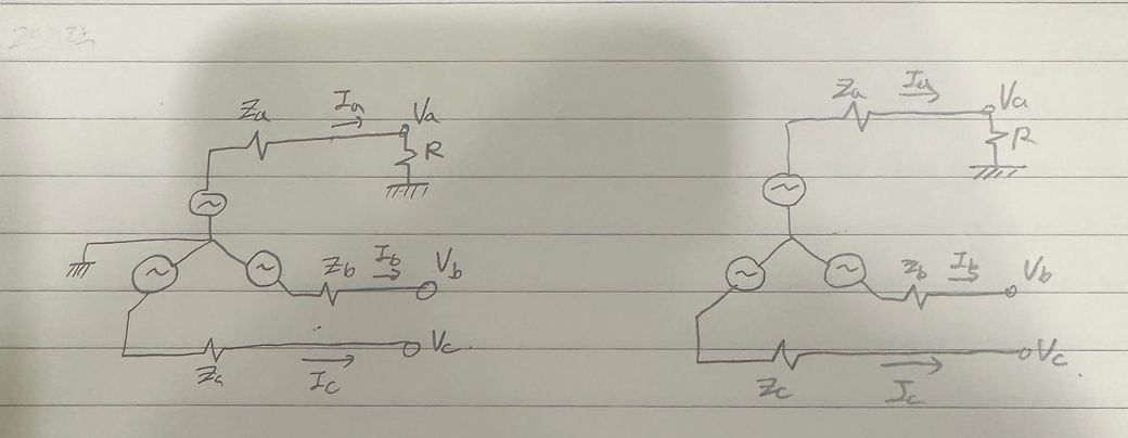 사진에 나온 발전기 회로에서 A상에만 저항이 존재하는데 대지 정전용량을 고려하지 않았을 때 왼쪽 회로처럼 직접접지를 했을때와 오른쪽 사진처럼 비접지를 했을때 단락전류는 어떻게 계산되나요?