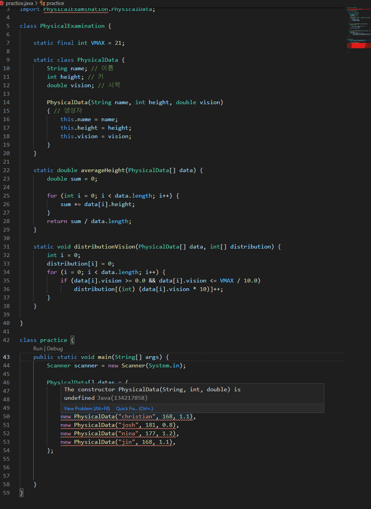 50~53 라인의 에러는 말씀하신대로 생성자 PhysicalData(String, int, double) 이 정의를 찾지 못했다는 메시지 입니다.