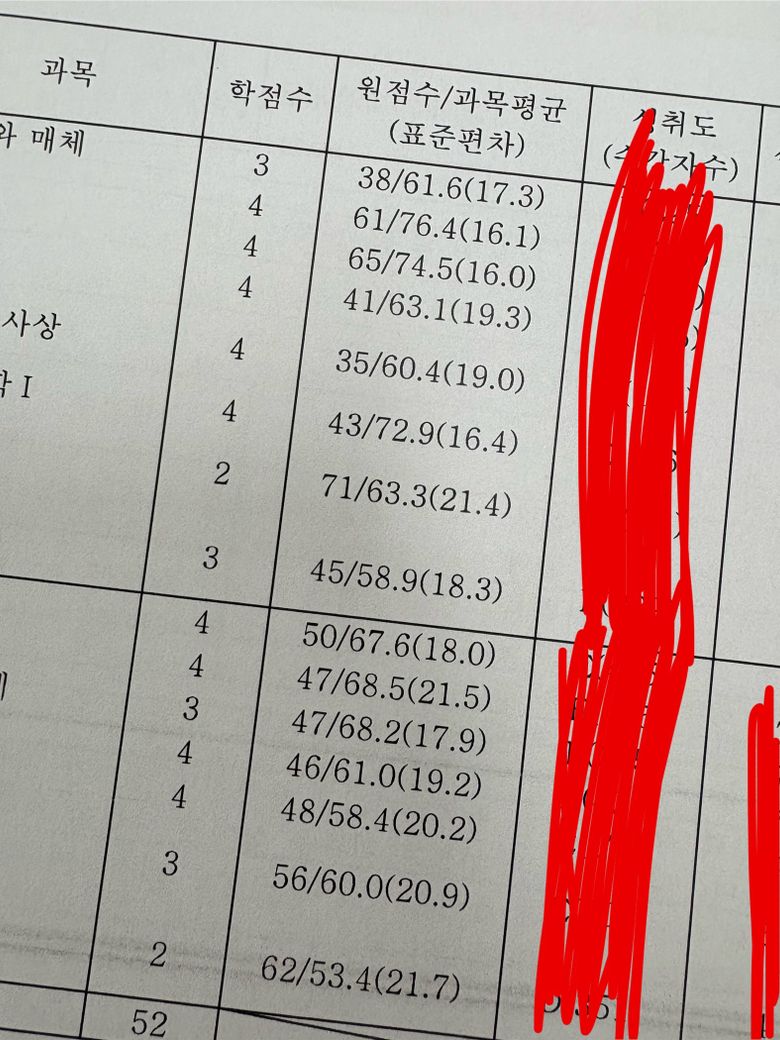세특을 보다가 원점수/과목평균(표준편차)를 보게 됐는데요. 왼쪽 숫자가 제 시험 점수인가요..? 아니겟죠.? 실은 이 숫자보다 더 낮게 맞았던 거 같은데