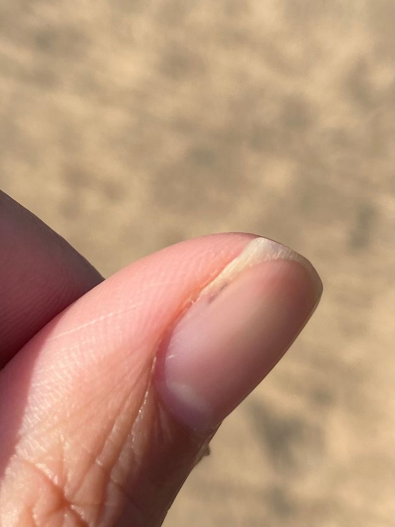 조갑하 선상출혈 (Splinter hemorrhage) 라고도 하며 마찰이나 외부 자극으로 손톱 아래에 작은 출혈이 생기는 것입니다.
