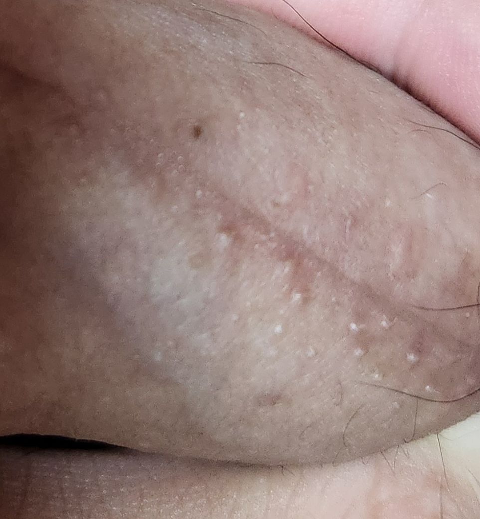 특별히 소양감 등이 없으시고, 의심되는 성관계 등도 없다면 성병보다는 모낭 및 진주양구진 등의 가능성도 있지만 증상이 있으시거나 점차 분포면적이 넓어지신다면 헤르페스 등의 감별을 위해 가까운 비뇨기과에 내원해 보시는 것을 추천드립니다.