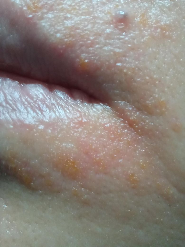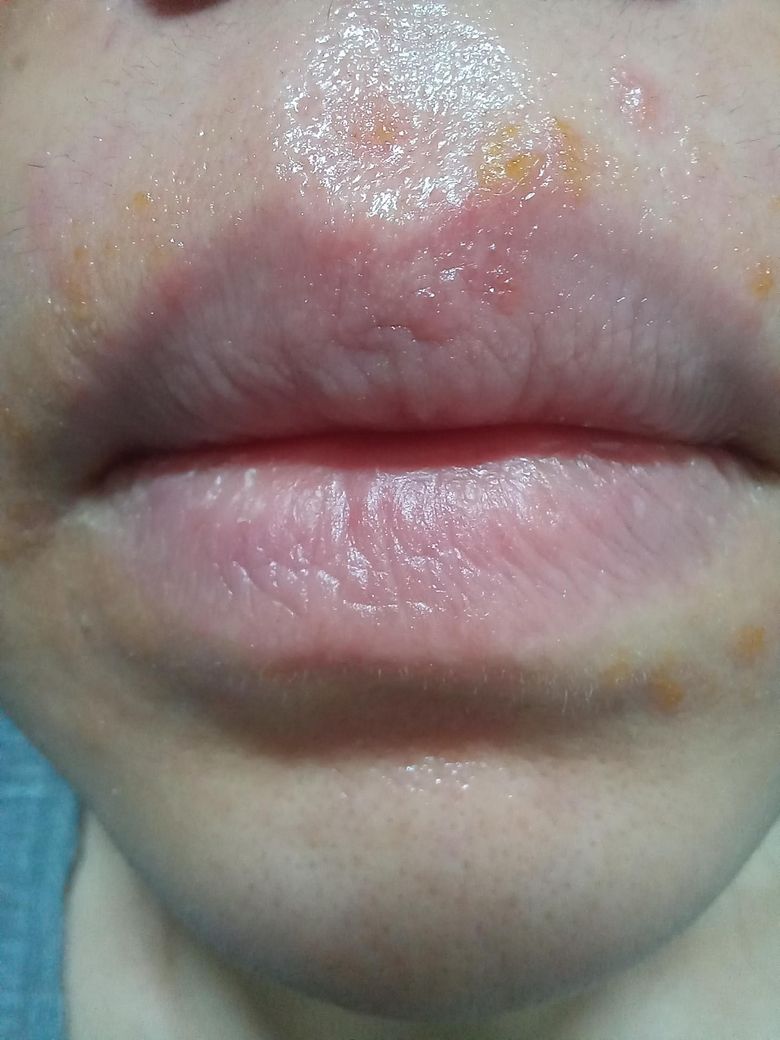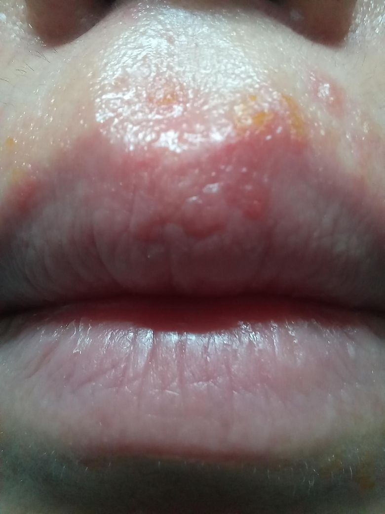 현재 서술된 경과를 종합하면 단순 구순염이라기보다 접촉성 피부염(알레르기 또는 자극성) 혹은 급성 두드러기/혈관부종 양상이 더 의심됩니다. 립밤 사용 직후 악화, 아시클로버 도포 후 급격한 부종과 수포, 입술 주변과 코까지 퍼지는 가려움과 팽진은 헤르페스보다 알레르기 반응 쪽과 더 일치합니다.