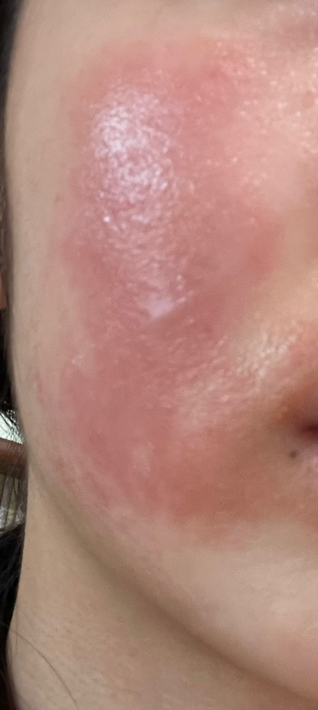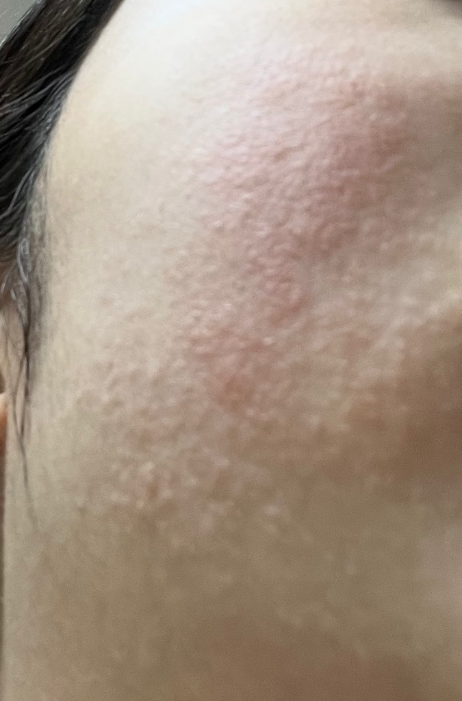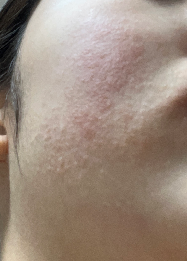 접촉성 피부염인거 같은데 원래 이정도 붉은기와 밑에서 찍었을때 오돌토돌했는데 덱스파놀 발라주면서 피부표면에 오돌토돌한게 많이 좋아졌거든요?? 근데 한통 다쓰고 디판테놀 발라주고 나서 였나 그쯤 타이밍이 겹쳐서 그런걸 수도 있는데 갑자기