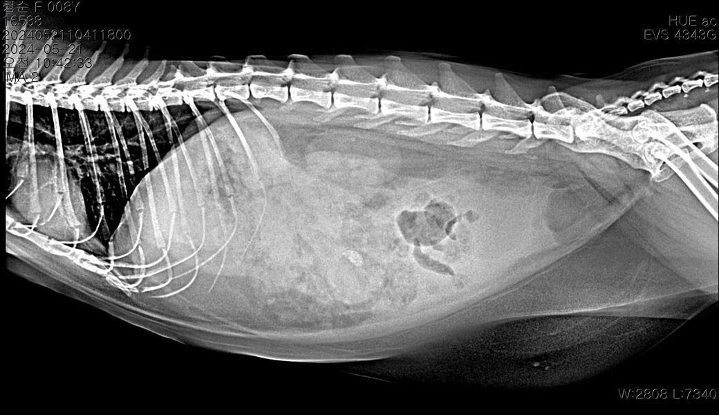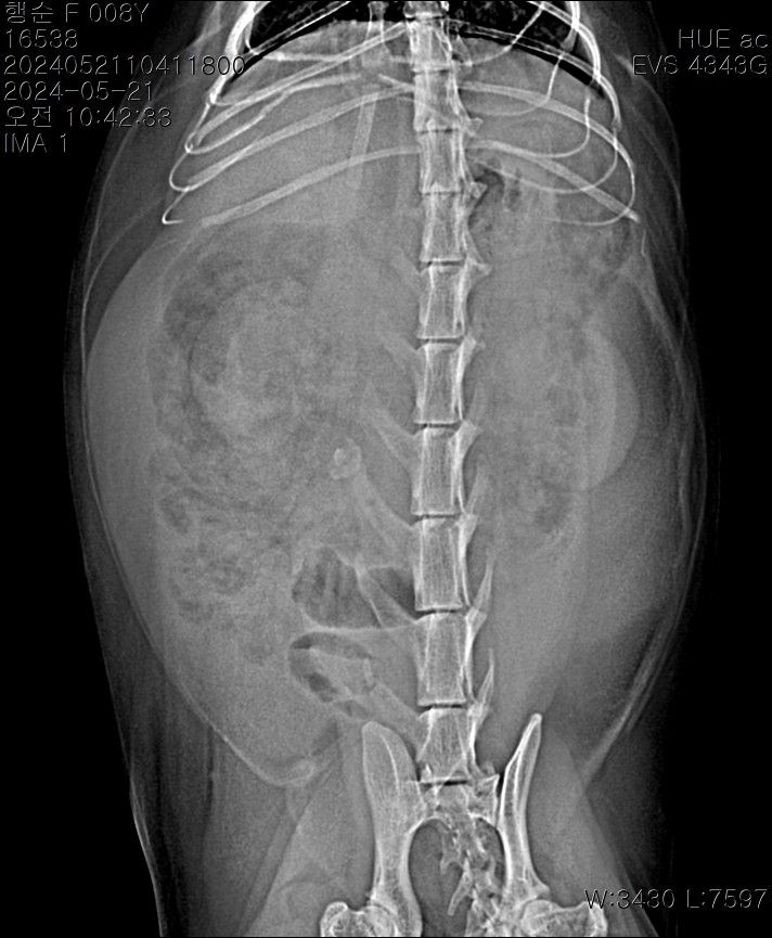 중등도 이상의 복수가 있는 상태이며 8세령이라면 복수의 원인으로 장파열에 의한 세균 감염성 복막염, 림프종과 같은 종양성 질환, 심장 질환, 대사성 질환, 고양이 전염성 복막염 등 다양한 원인을 고려해야 합니다. 복수에 대한 복수 검사를 기본으로 전신적인 종합검사가 필요합니다.