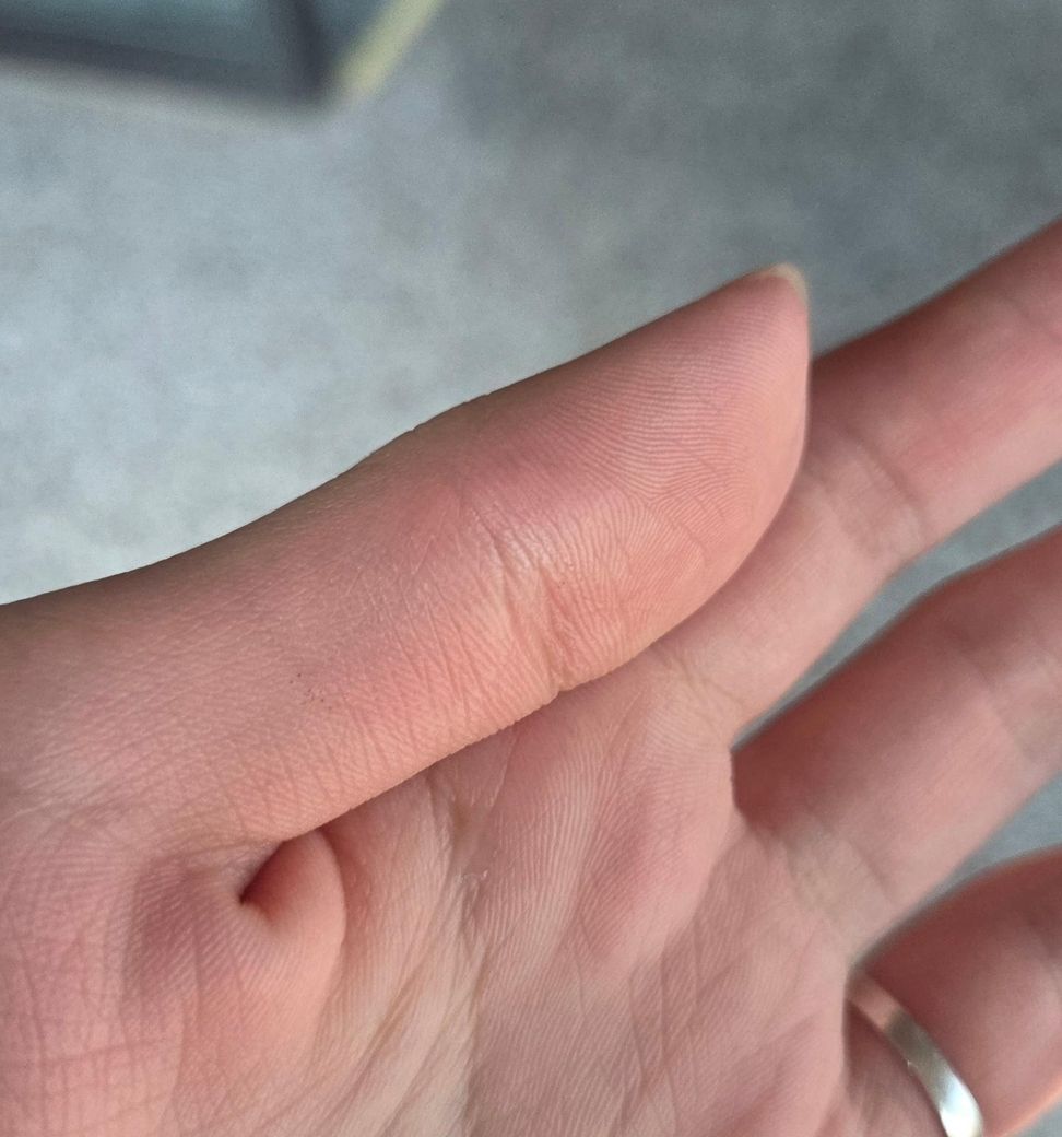 엄지 관절 쪽인데요 물로 식히고 보니까 조금 하얗게 됐네요. 사진보다 조금 더 그렇습니다. 1cm정도 되는 것 같아요.