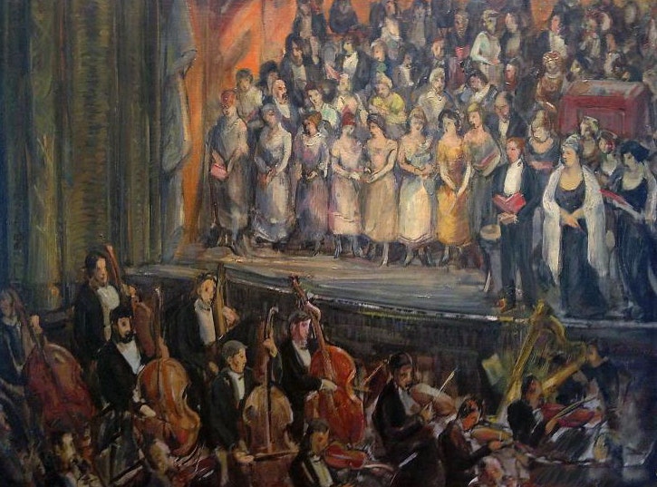 테레사 번스타인(Teresa Bernstein)은 20세기 미국의 화가로, 주로 풍경화와 인물화를 그린 작가입니다. 그녀는 특히 일상적인 장면을 따뜻하고 생동감 있게 표현하는 것으로 알려져 있습니다. 그녀의 작품 중에는 음악, 무대, 그리고 사람들 간의 상호작용을 주제로 한 그림도 많습니다.그녀의 그림 중 무대에서 찬송가를 부르는 장면이 있다면, 그 그림은 아마도 공동체의 문화나 종교적 활동을 반영하고 있을 것입니다. 테레사 번스타인의 작품은 감정이 풍부하고, 생동감 넘치는 색채가 특징이에요.