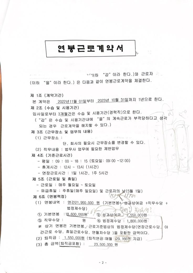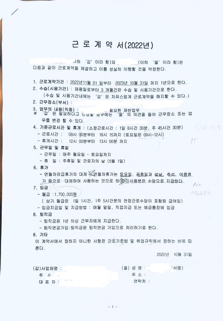 상기 첨부한 근로계약서에 따르면, 최저임금에 미치지 못하는 임금을 지급하고 있으며, 연차휴가는 소정근로일에 대하여 근로제공의무를 면제 받는 것이므로, 연장근로일인 토요일 및 법정휴일인 공휴일(설, 추석)에 연차휴가를 대체(사용)할 수 없습니다. 또한, 근로시간 산정이 어려운 경우가 아니므로 포괄임금약정은 유효하지 않으며, 근로기준법에 따라 연장/야간/휴일근로수당 및 연차휴가미사용수당을 별도로 청구할 수 있습니다.