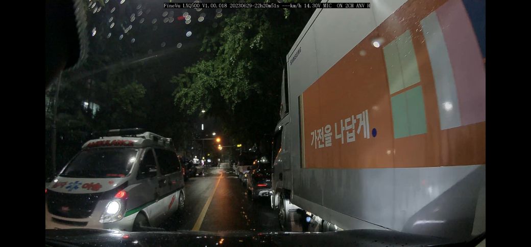 마주오는 앰뷸런스를 비켜주려다가 도로 위에 불법주차