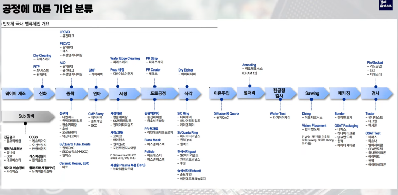 반도체 패키징은 반도체와 기기의 전기적 연결과 포장 작업을 의미합니다. 단순한 연결이 아닌 과거 System on Chip 같은 다양한 chip을 하나로 만들어서 기기와 연결하는 패키징 작업도 포함됩니다. 아래 반도체 value chain 참고하시기 바랍니다.