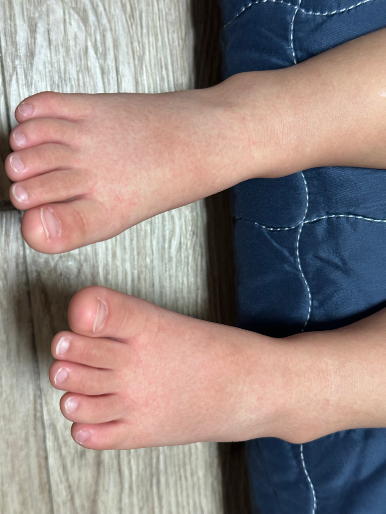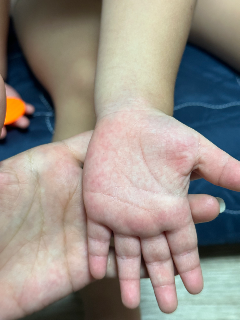 사진의 소견으로 보기에는 애매하긴 합니다만 단순 돌발진 가능성 보다는 수족구병의 가능성이 추웁ㄴ히 있어 보입니다. 발열 증상까지 동반되었다면 병원에서 진료를 받고 정확한 감별 진단을 받으시는 것이 필요해 보입니다.