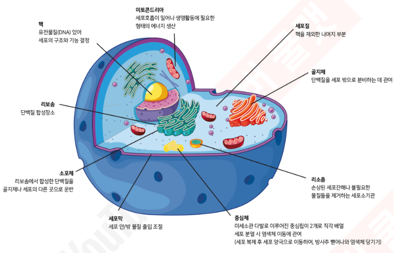 세포는 생물을 구성하는 기본 단위로 세포막이 있고 안에 미토콘드리아, 세포질, 핵등 여러가지 기관이 들어있습니다.