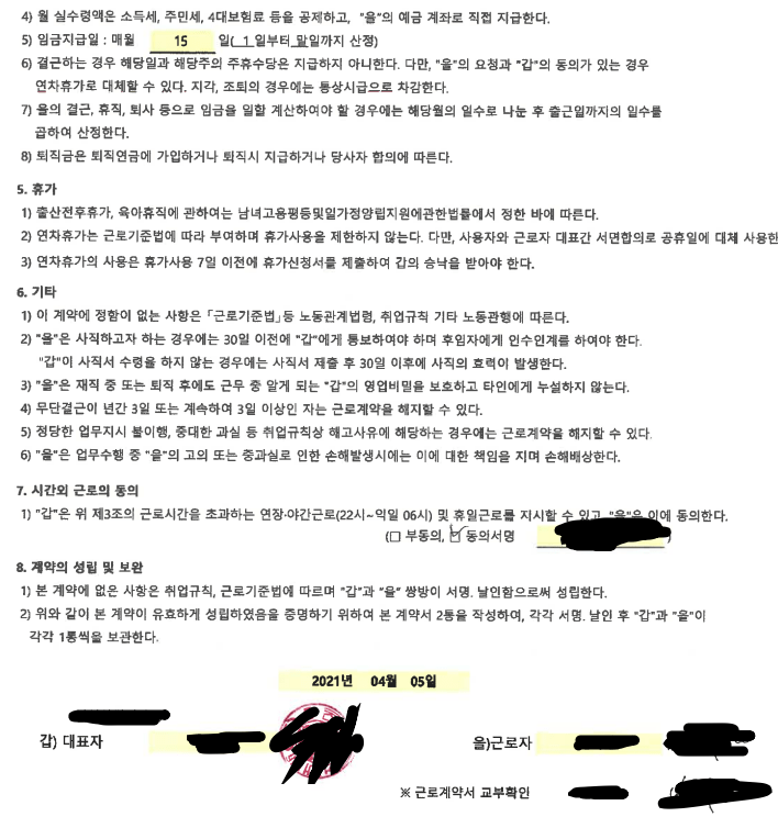 근로기준법은 강행규정이기 때문에 당사자간 합의로 근로기준법 미만의 근로기준을 적용하기로 계약서를 작성하고 합의하였다 하더라도 그 부분은 무효가 되고, 무효가 된 부분은 근로기준법 내용이 대체됩니다.
