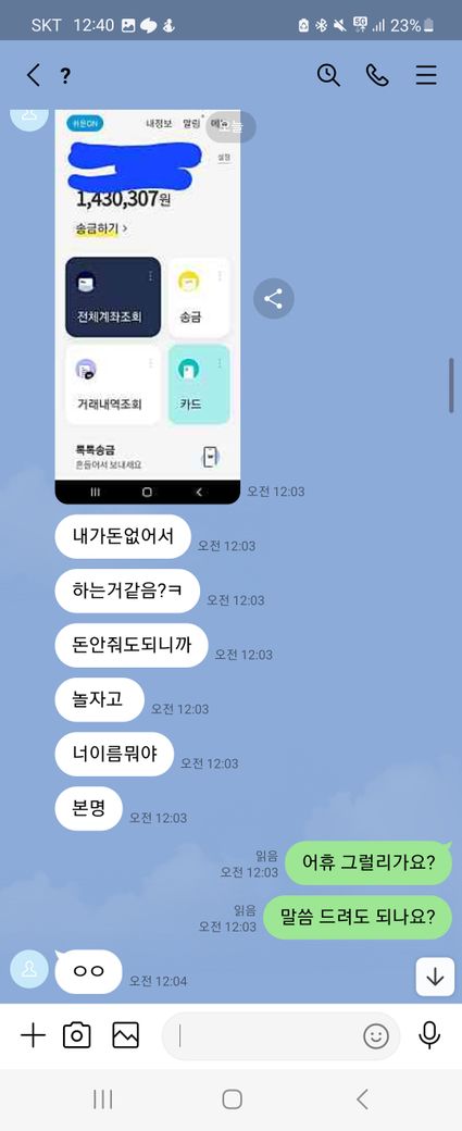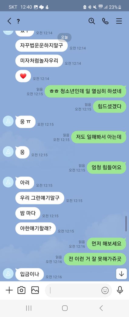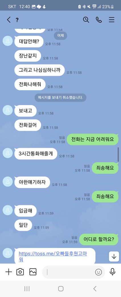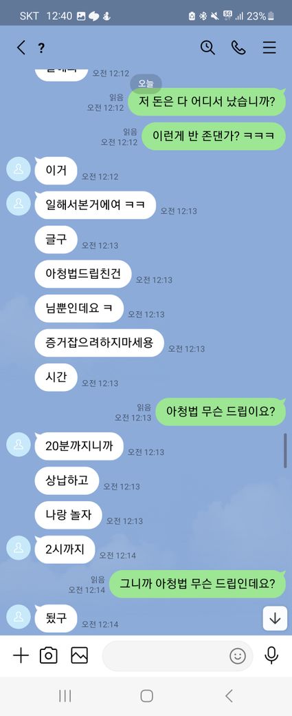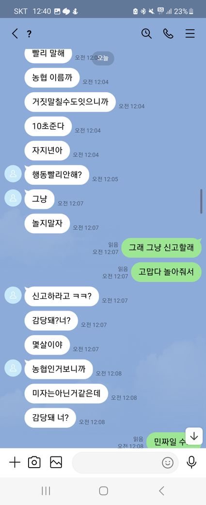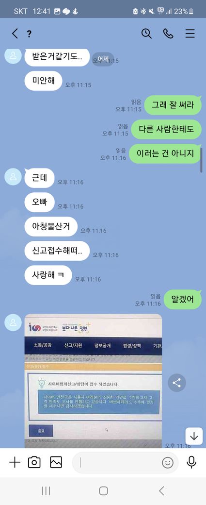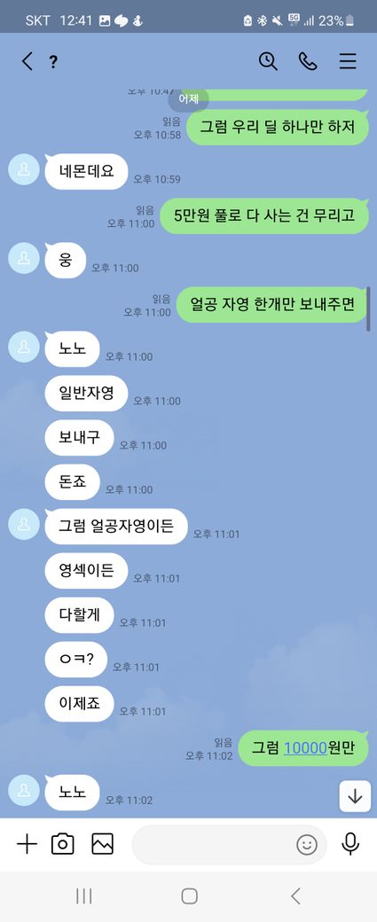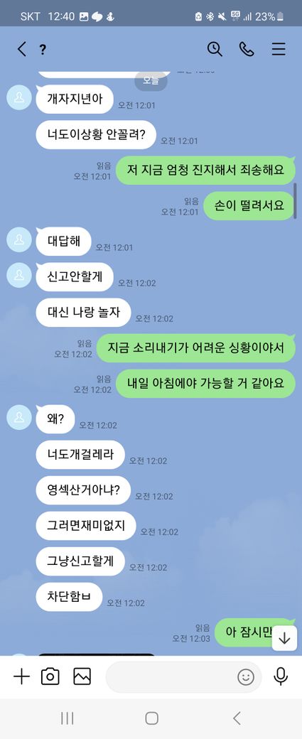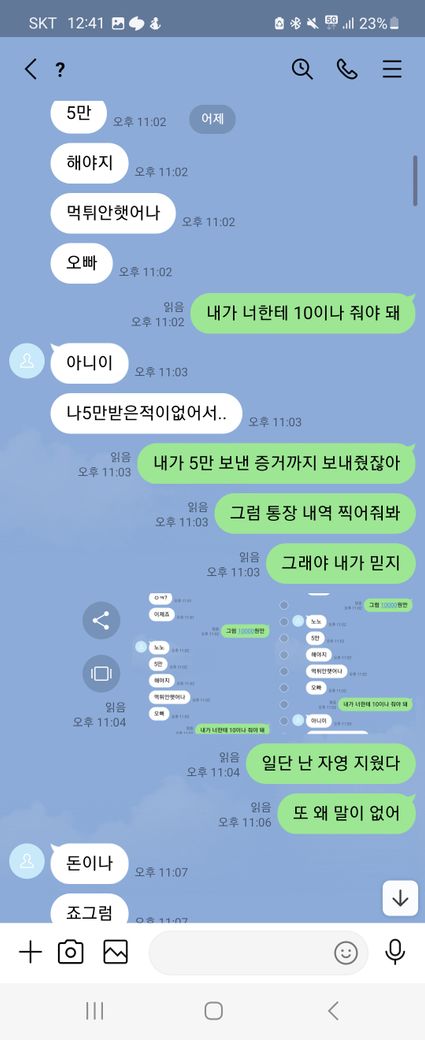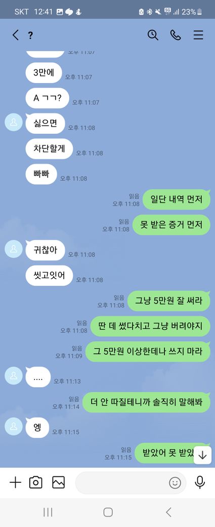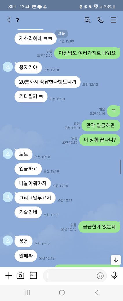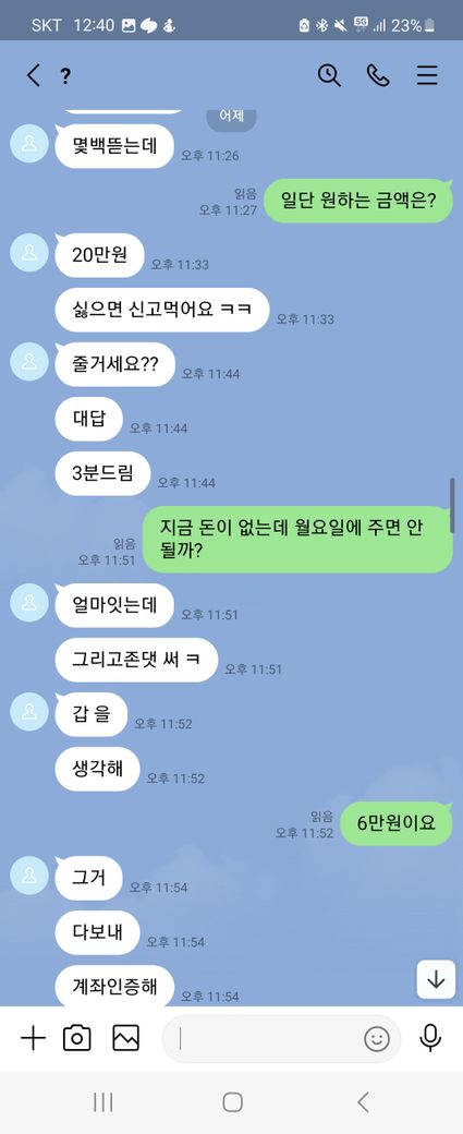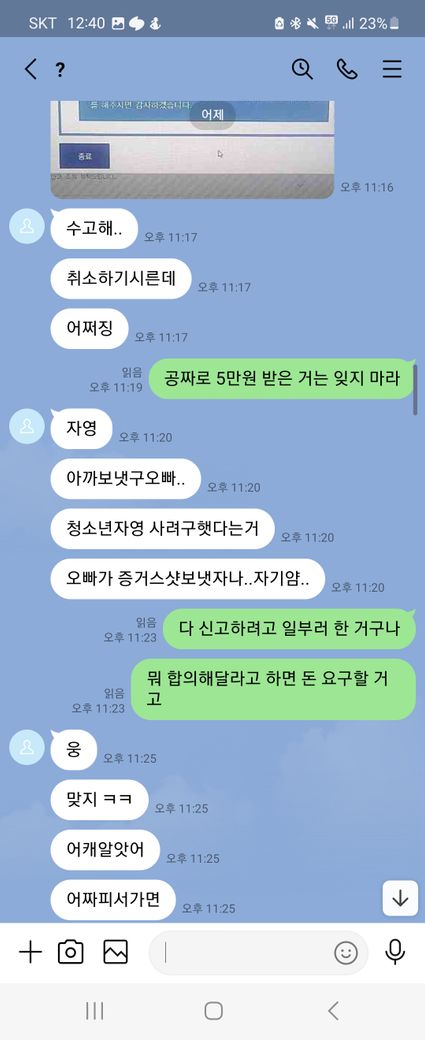 이런말 허기 부끄럽지만 래여되겠네요. 제가 트위터를 보다가 자영 판매를 한다기에 라인으로 연락을 주고 받으면서 구매를 할려고 했어요. 근데 첫 날에 5만원을 보냈는데 영상을 안 보내주길래 그 다음 날에 연락을 해서 영상을 줘라했는데 기억이 안 난다면서 돈을 계속 더 달라는 거에요 그래서 안 된다 그냥 영상을 주라고 했는데 계속 안 된다고 하면서 그럼 영상을 하나 보내주면 10000원을 줄테니 다른 영상까지 줘라라고 제가 제안 했더니 갑자기 영상한개를 보내더니 영상 줬으니 5만원을 달라고 하는 거에요. 그래서 안 된다고 하면서 저는 그 영상을 보지 않고 바로 지워 버렸어요. 그래서 상황이 끝난 줄 알았는데 근데 갑자기 저한테 아청물 신고했다고 합의할려면 20만원 보내주라면서 협박하는 거에요. 그래서 저는 너무 겁나서 지금 6만원 밖에 없으니 이거라도 보내주겠다하고 그 사람이 알겠다 하길래 보내줘야 되겠다하는데 생각해봤는데 이 사람이 계속 이상한 말들은 하길래 그냥 장난치는거구나 하고 저는 그냥 돈을 안 보냈어요. 그랬더니 마지막에 돈 안 들어왔다고 조만간 보자면서 막 협박하는데 저 어떡하죠