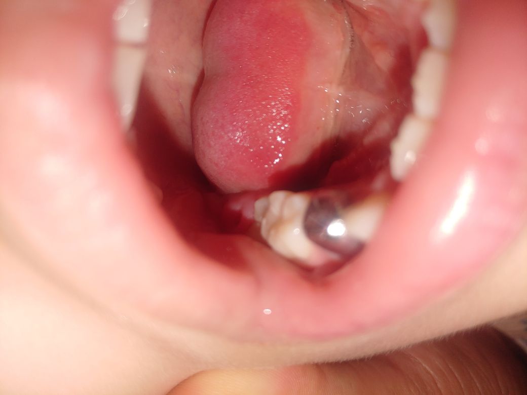 다만, 어금니 끝쪽에 영구치(첫번째 큰 어금니)가 맹출하면서, 이를 덮고 있던 주위의 치조골(뼈) 조각이 일부 나온 것일 가능성이 높아 보입니다.