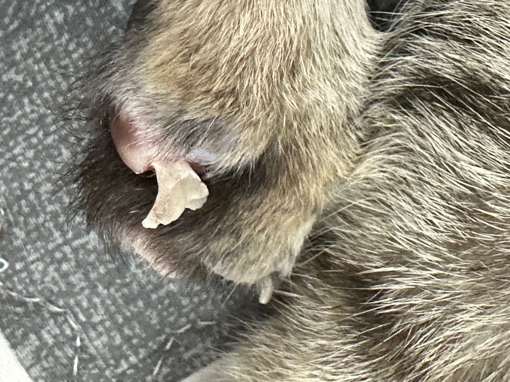 그냥 두시고 혹시나 염증이 심하게 생겨서 자주 핥거나 아파하는 경우 병원 가셔서 진료 보시는 것을 권유드립니다.