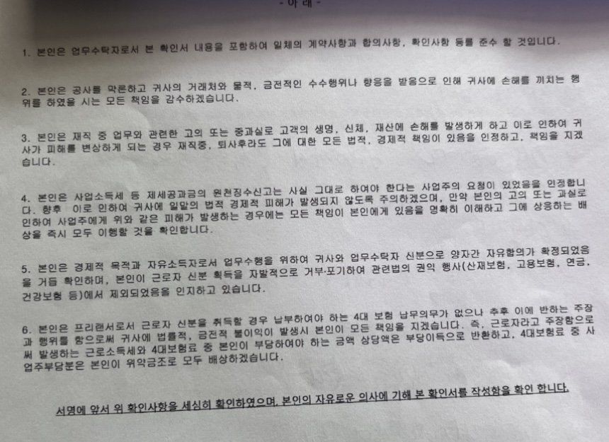 계약서상 내용으로는 근로자성이 인정될 만한 내용이 없습니다. 오히려 근로자성을 부인하는 내용들(근로자 신분 획득 자발적 거부 포기 등)이 일부 있습니다.