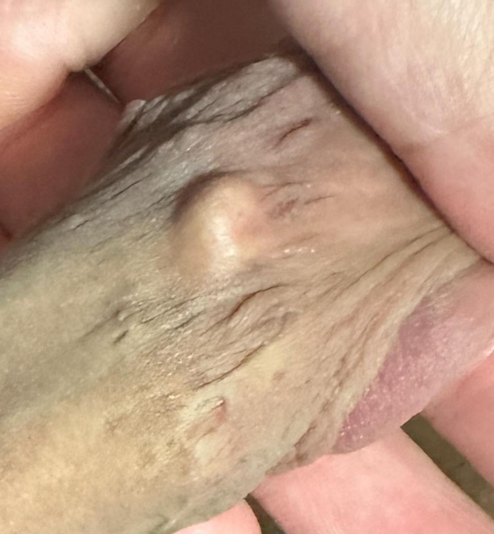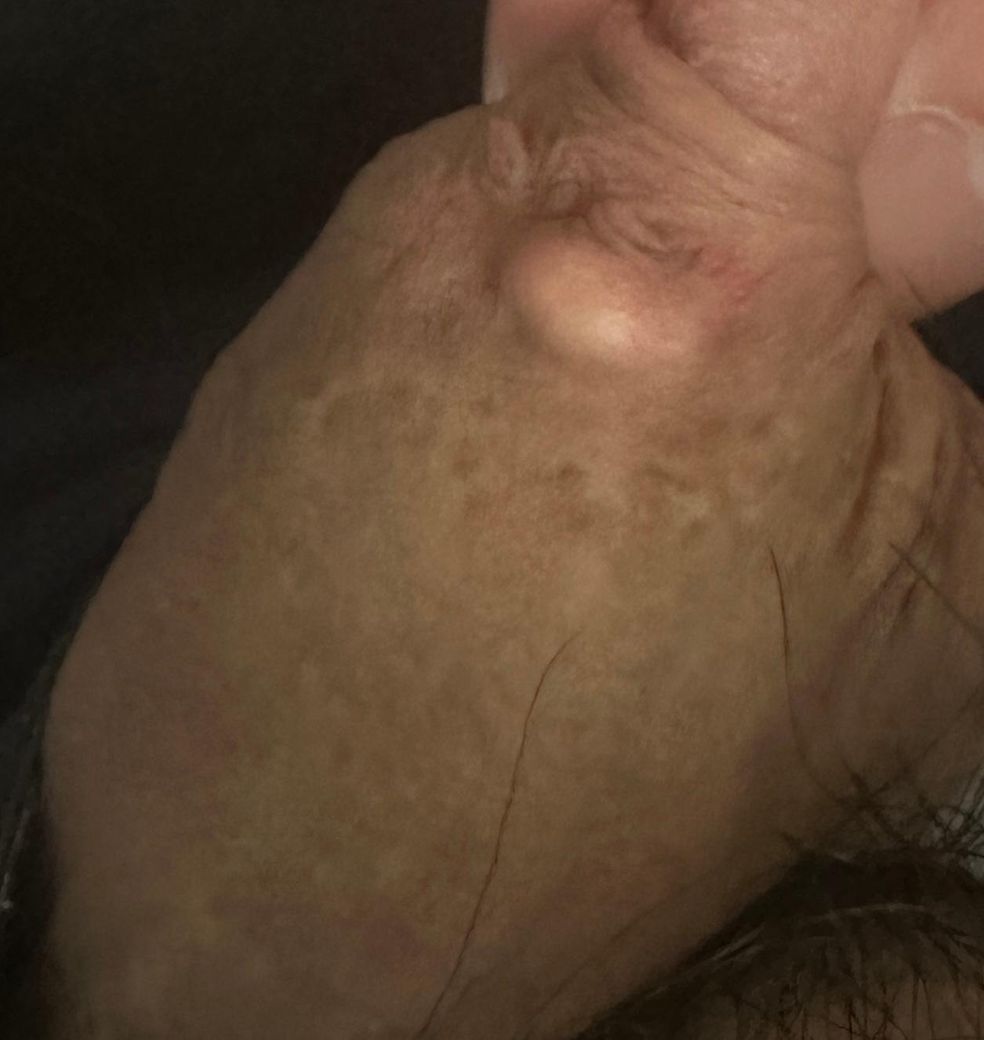 일반적으로 곤지름을 강력하게 의심하여야 할만한 소견으로 보이지는 않습니다. 곤지름의 가능성은 낮아 보이며 그보다는 무언가 안에 결절이 생긴 것일 가능성이 높아 보이긴 하겠습니다. 보다 자세하게 파악하고 구체적인 감별 진단을 받아보시기 위해서는 실질적으로 비뇨의학과 진료 및 검진을 받아보시는 것이 적절할 것으로 사료되는 부분입니다.