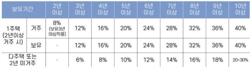 거주 및 보유기간에 따라 장기보유특별공제를 적용받을 수 있습니다. 일반적으로 1년당 2%(최소 3년 6% ~ 최대 15년 30%)를 공제받을 수 있습니다.