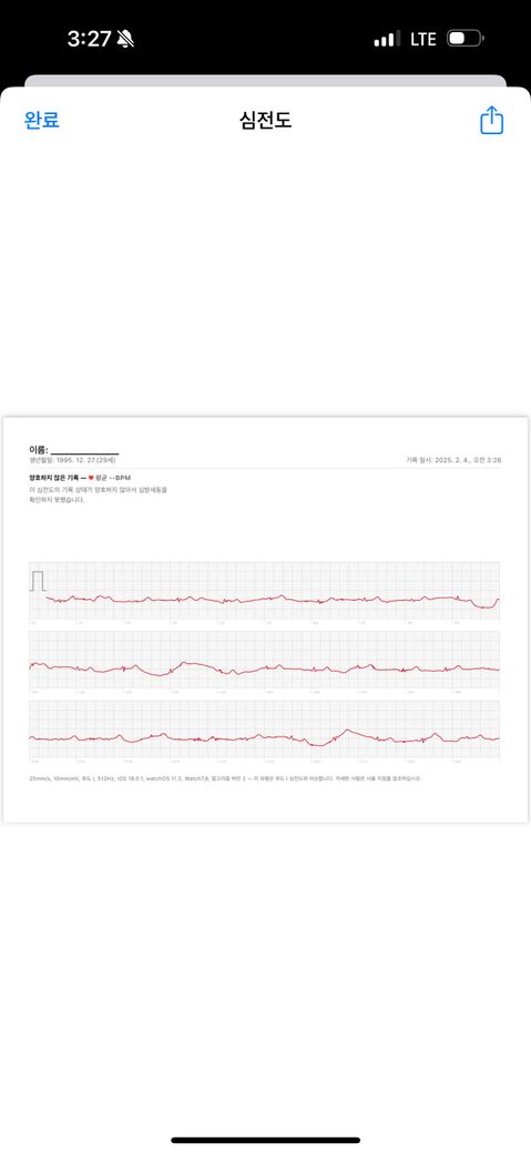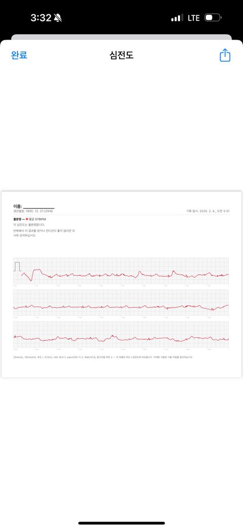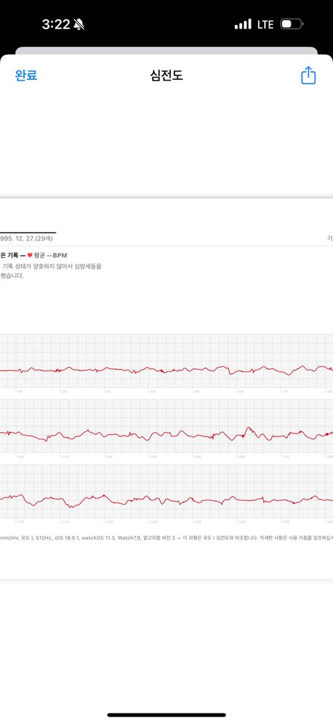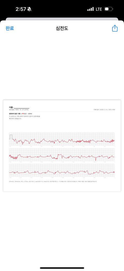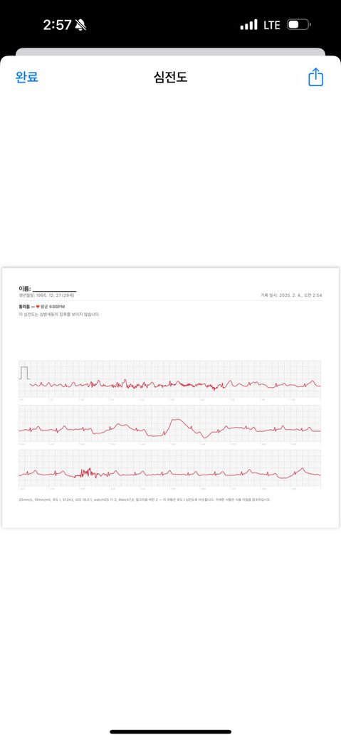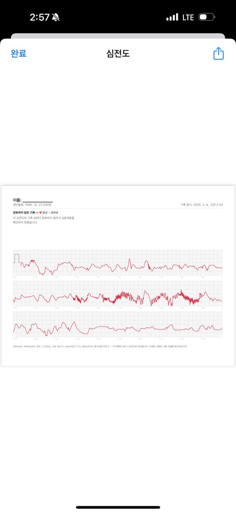 심실조기수축이 살빡 잇는느낌이라 애플워치로 심전도 해봣는데 정상인가요??? 그래프가 들쑬날쑥이긴한데 최대한 앉아서 침착하게 잴려해도 이렇게 나오네요 문제잇는걸까요? 앉아서 침착하게 가만히 안움직이고 잿는데 그래프가 이런거면 혹시 문제있는걸까요?
