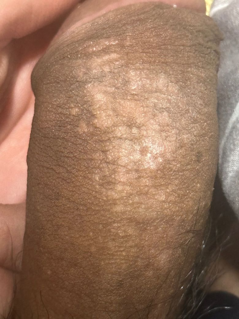 사진상으로는 귀두 피부에 다수의 불규칙한 흰색 반점과 약간의 위축, 표면이 건조해 보이는 변화가 관찰됩니다. 말씀하신 경과(약 3개월 사이 점차 확대)와 형태를 고려하면 몇 가지 가능성을 우선 감별하게 됩니다.