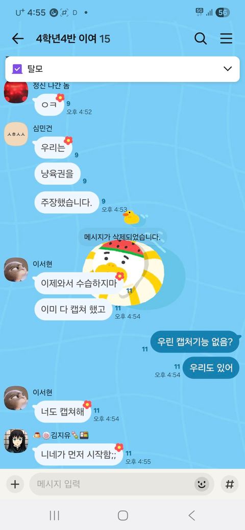 현재 질문에 기재해주신 내용만으로는 형사처벌 대상이 되는 것이라고 보기 어렵고 학교폭력 대상이 되는지도 의문입니다 삭제된 메시지가 어떠한 내용이었는지도 확인이 되지 않아 판단이 어려운 점 감안하여 주시기 바랍니다